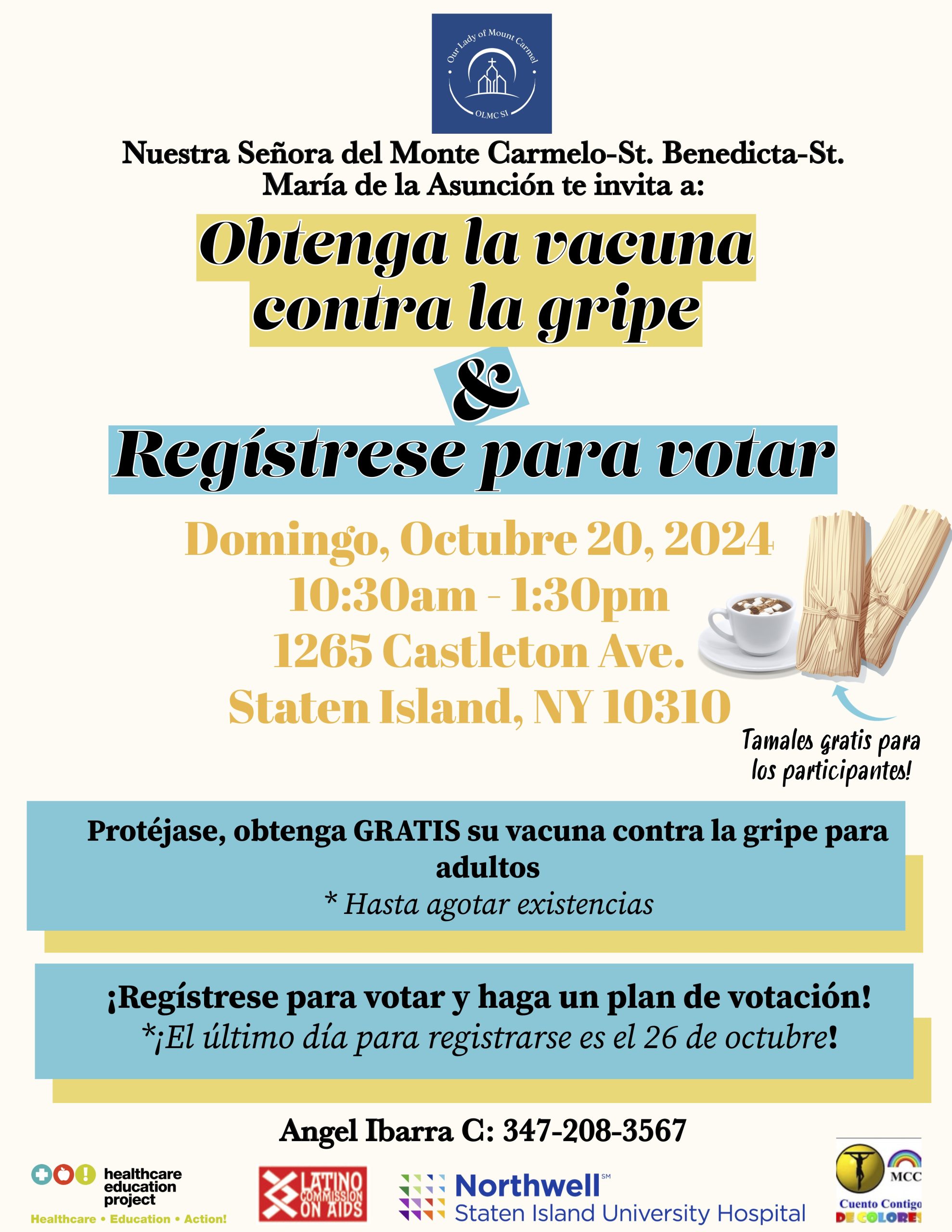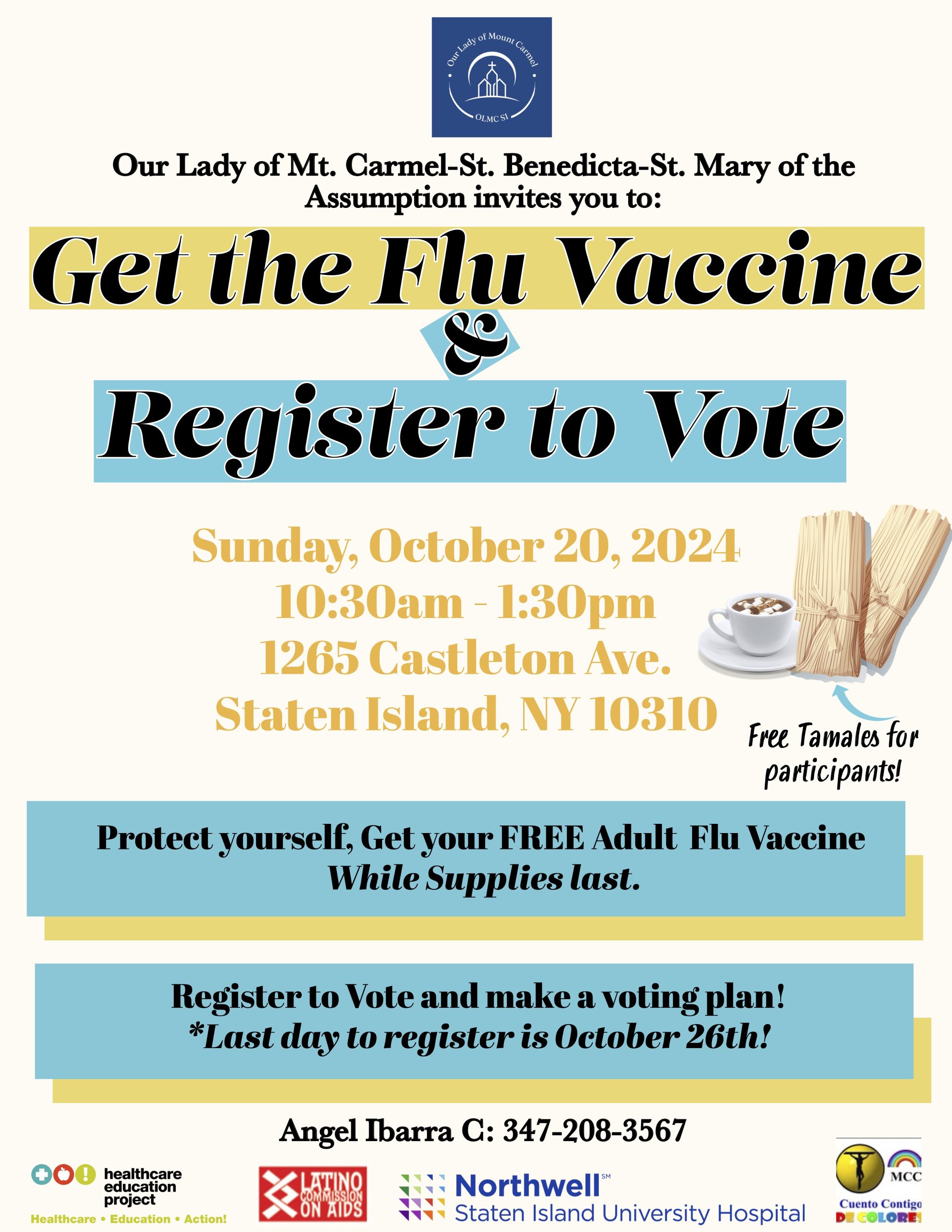 Our Lady of Mt. Carmel-St. Benedicta-St. Mary of the Assumption invites you to Get the Flu Vaccine & Register to Vote! Protect yourself. Get your free adult flu vaccine while supplies last. Free tamales for participants!